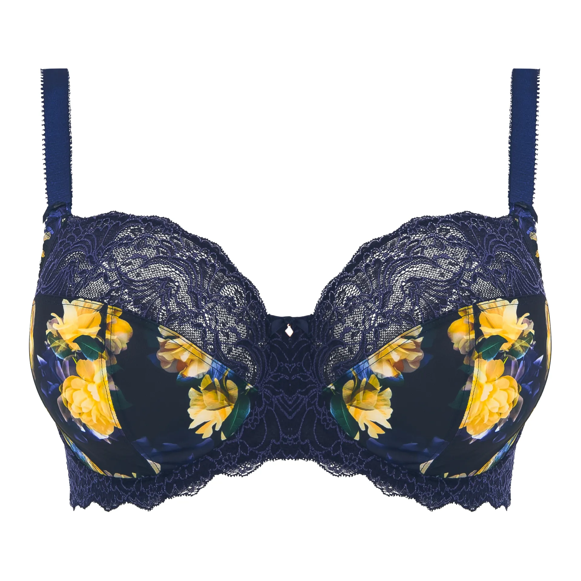 The Lucia bra from Fantasie in Navy is a beautiful underwired bra with additional side support. The striking floral print combines warm creams and vibrant yellows with a navy base to give a gorgeous feminine feel. All items are cut from a soft handle fabric, pair with some of our other stunning items from this range for a perfect set.