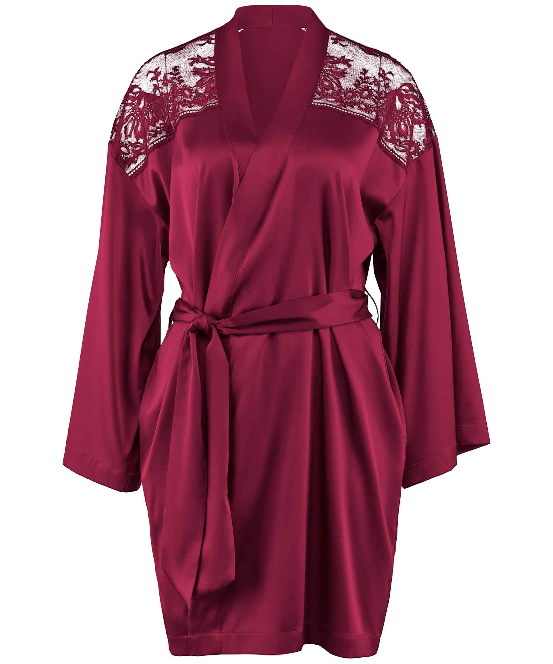 The Aubade Midnight Whisper Silk Kimono in a rich Crimson Red colour is a flattering wrap over style with lace trim detail across the shoulders for a beautifully feminine style.