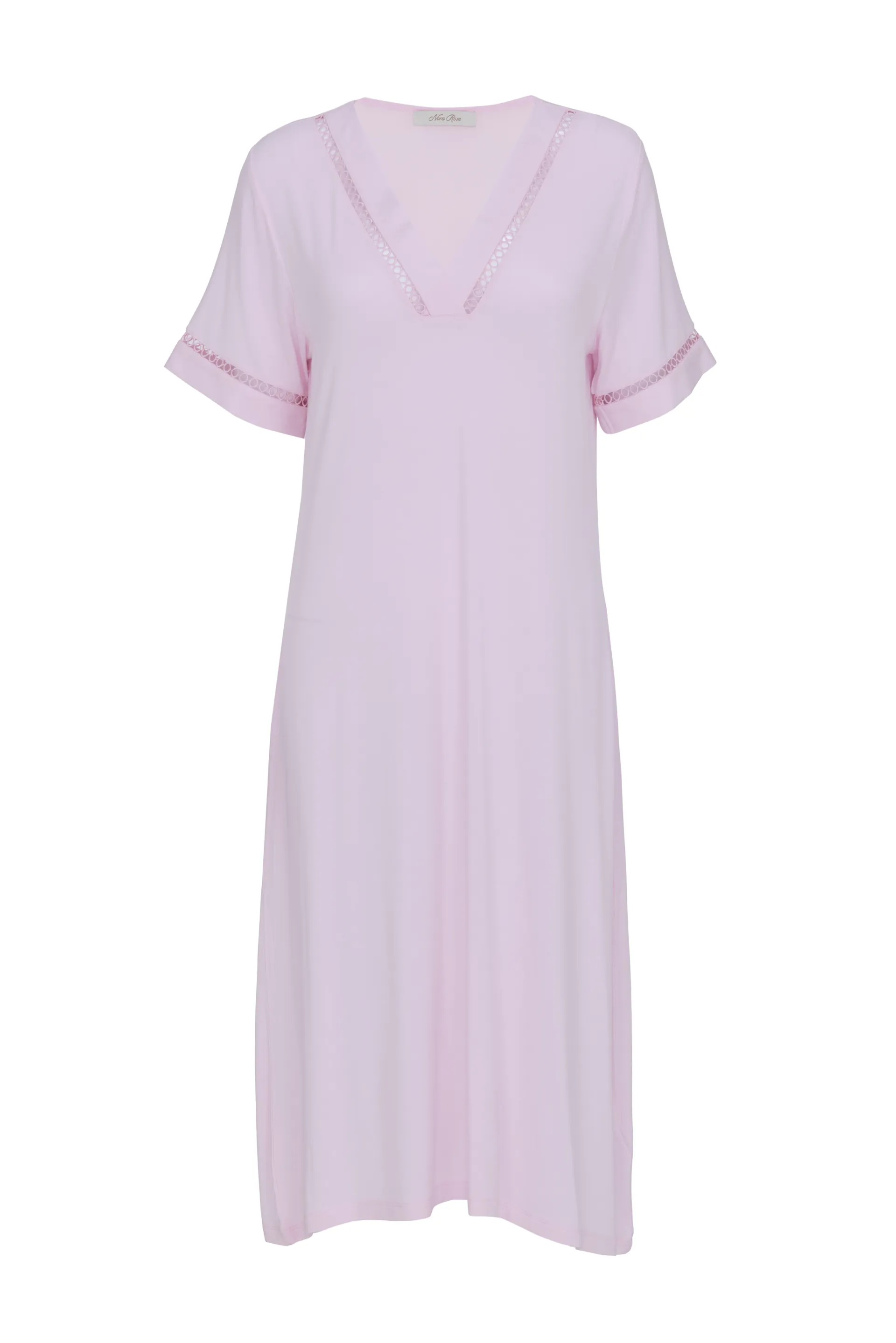 The Cyberjammies Nora Samantha Short Sleeve Nightdress in Pink is made from a modal / elastane blend. This V-Neck nightdress feels soft and gentle against the skin, beautiful pink trim detail decorates the neckline and sleeves. Lightweight and flowing, this is the perfect addition to your nightwear collection.