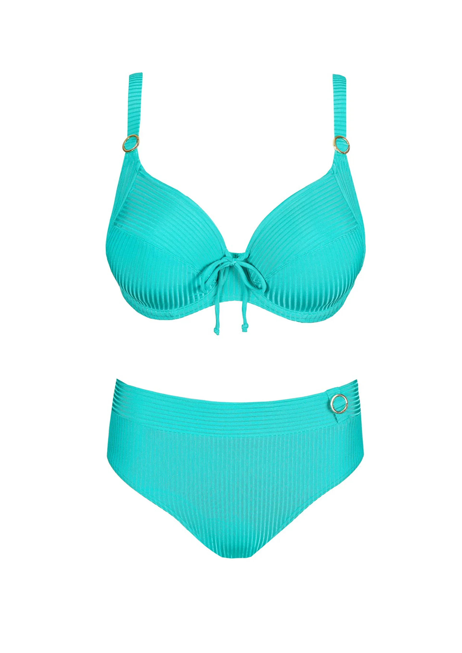 This beautiful set from Prima Donna includes a full cup bikini top with a full Brief. The Delay range is a stunning combination of comfort and luxury, the aqua green fabric has a textured finish with added ring and tie detail finishing the look.