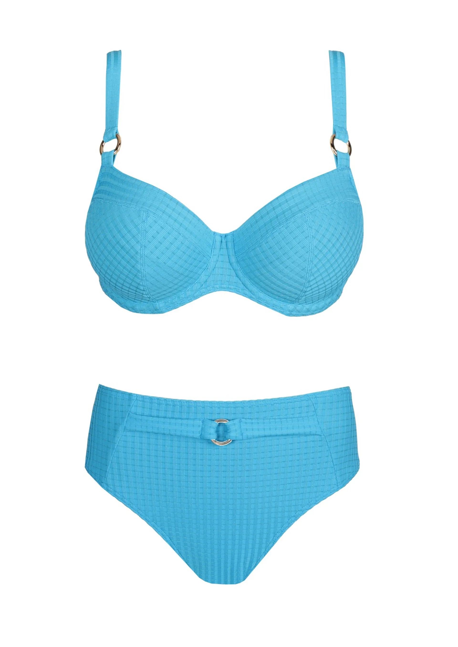 This beautiful set from Prima Donna includes a full cup bikini top with a full Brief. The Ocean inspired Kochi range is a stunning combination of comfort and luxury. The vibrant blue fabric has a textured finish with added belt and ring detail finishing the look.